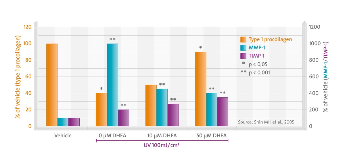 In this study, we demonstrate that DHEA can increase procollagen synthesis and inhibit collagen degradation by decreasing matrix metalloproteinases (MMP)-1 synthesis and increasing tisuue inhibitor of matrix metalloprotease (TIMP-1) production in cultured dermal fibroblasts. DHEA was found to inhibit ultraviolet (UV)-induced MMP-1 production and the UV-induced decrease of procollagen synthesis, probably due to the inhibition of UV-induced AP-1 activity. DHEA (5%) in ethanol:olive oil (1:2) was topically applied to buttock skin of volunteers 12 times over 4 weeks, and was found to significantly increase the expression of procollagen alpha1(I) mRNA and protein in both aged and young skin.